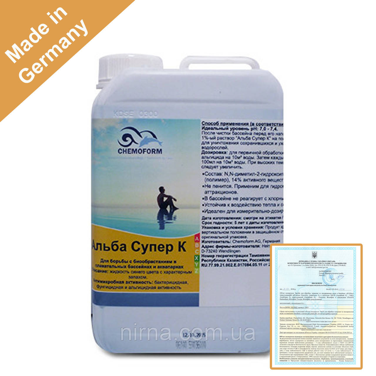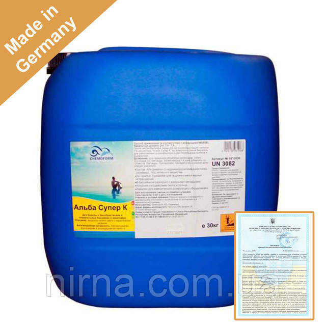 Альба Супер К Chemoform – рідкий, не піниться альгіцид з потужним бактерицидну, протигрибкову і противоводорослевым дією, призначений для запобігання появи і усунення водоростей, бактерій, грибків у воді басейну.